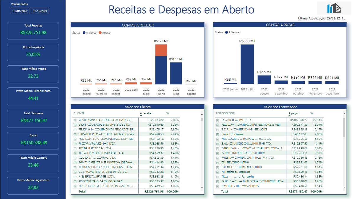 Fluxo de Caixa previsto e realizado, Indicadores de Inadimplência, Gestão completa das Receitas e Despesas.
